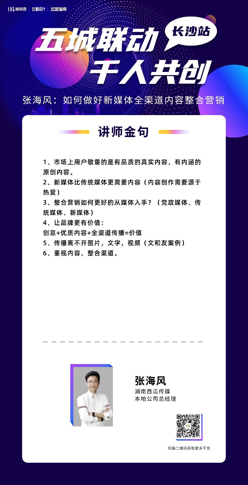 疫情之后的第一个夏天,135编辑器、比格设计和运营指南、湖南省数字商务协会作为战略合作方,联合举办了《五城联动 千人共创》线下运营人大会,聚焦新形势下的创意内容和私域增长,于6月6日在长沙设立活动点,为广大运营人提供最新的风向标。
